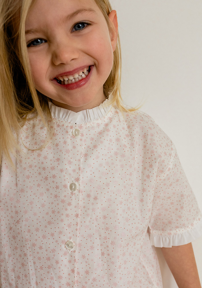 Pijama com folhinho branco na gola, mangas e calções. Dois bolsos. Manga curta.