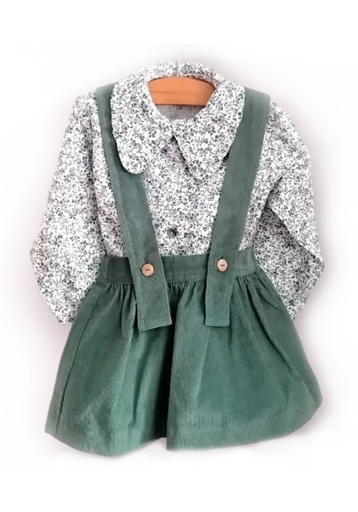 Saia em bombazine com alças e botões de madeira. Elástico na cintura atrás.