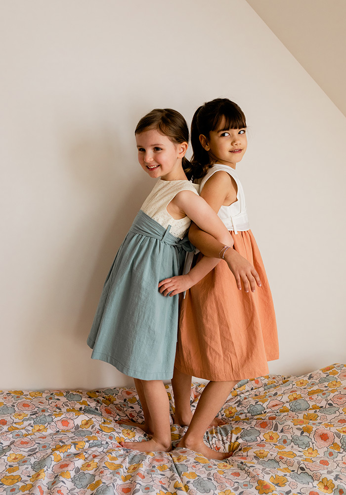 Vestido sem manga. Faixa que aperta atrás com laço.